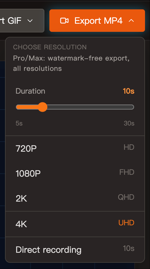Whether you are on the Animation Detail page or the Creation page, open the Export MP4 dropdown. At the very bottom you will see Direct Recording.